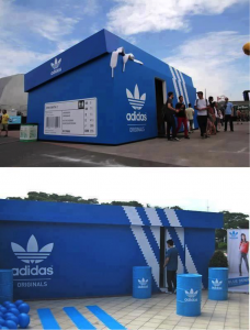 En el caso de esta tienda emergente de Adidas, toda la tienda está diseñada para ser llamativa. Se basa en la forma de una caja de zapatos con la marca Adidas, e incluso tiene un par de cordones de entrenamiento que sobresalen de la parte superior de la caja.