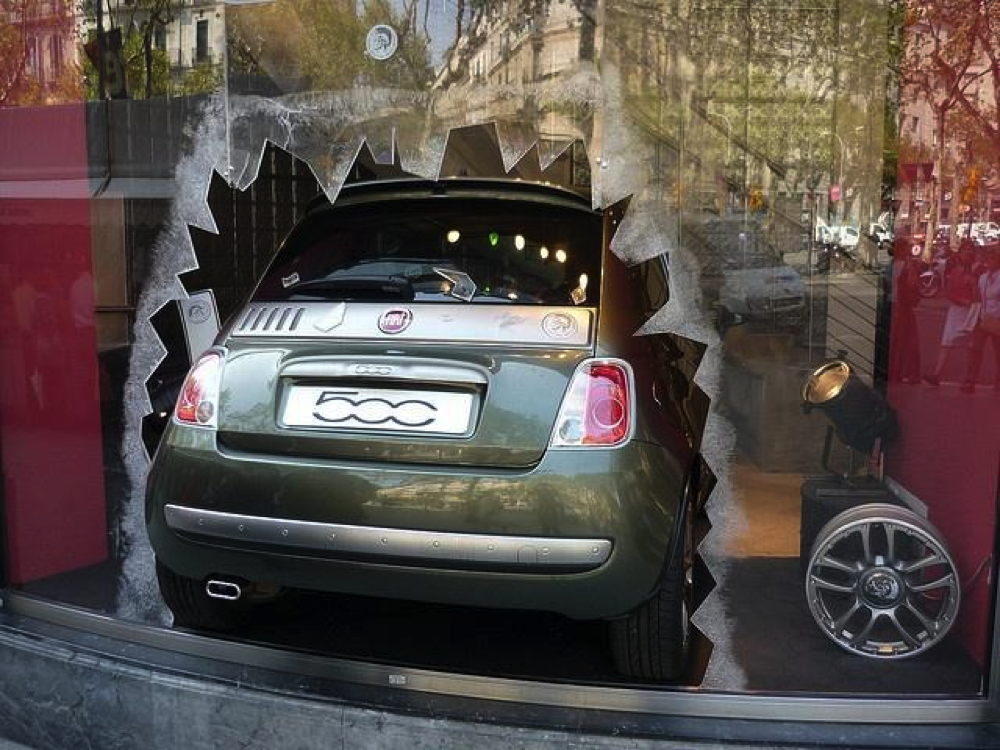 Esta sala de exhibición de autos ha llevado la exhibición de la ventana a un nuevo nivel al crear el efecto de un auto chocando por la ventana en la tienda. Para agregar al efecto, la ventana tiene un borde irregular y un efecto de vidrio roto aplicado alrededor del borde.