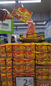 Este llamativo material de punto de venta de Maggi es semitransparente, lo que da la ilusión de que el producto se vierte desde arriba sobre la pila de productos, que están listos para comprarse debajo.