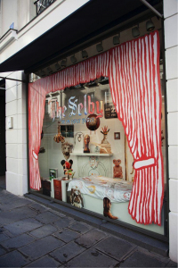 Algunos de los escaparates más eficaces combinan el tratamiento de las ventanas con el contenido del interior. Esta ventana de The Selby utiliza las cortinas impresas en el exterior de las ventanas para enmarcar el interior.